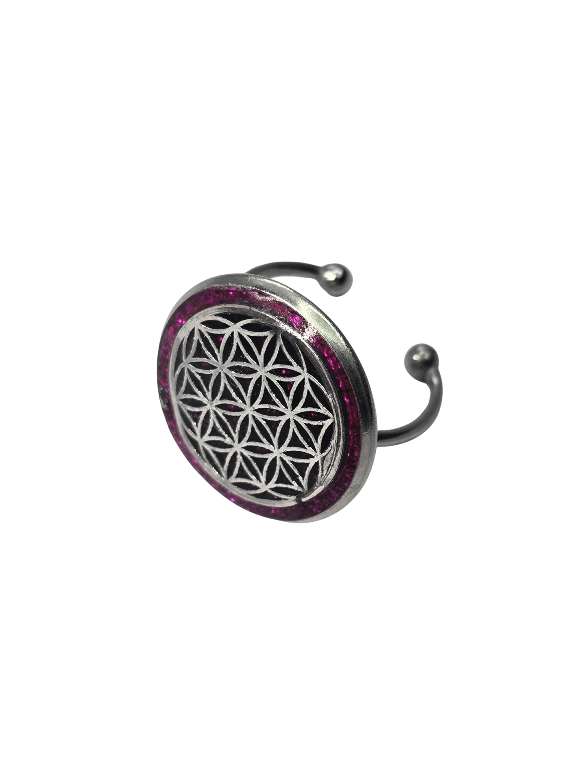 La Bague Fleur de Vie Fuchsia « Éclat Intérieur » est conçue en acier inoxydable et ajustable afin de s’adapter à différentes tailles de doigt. Son motif rond met en valeur une teinte fuchsia profonde associée à un fond en résine pailletée qui capte la lumière à chaque mouvement.