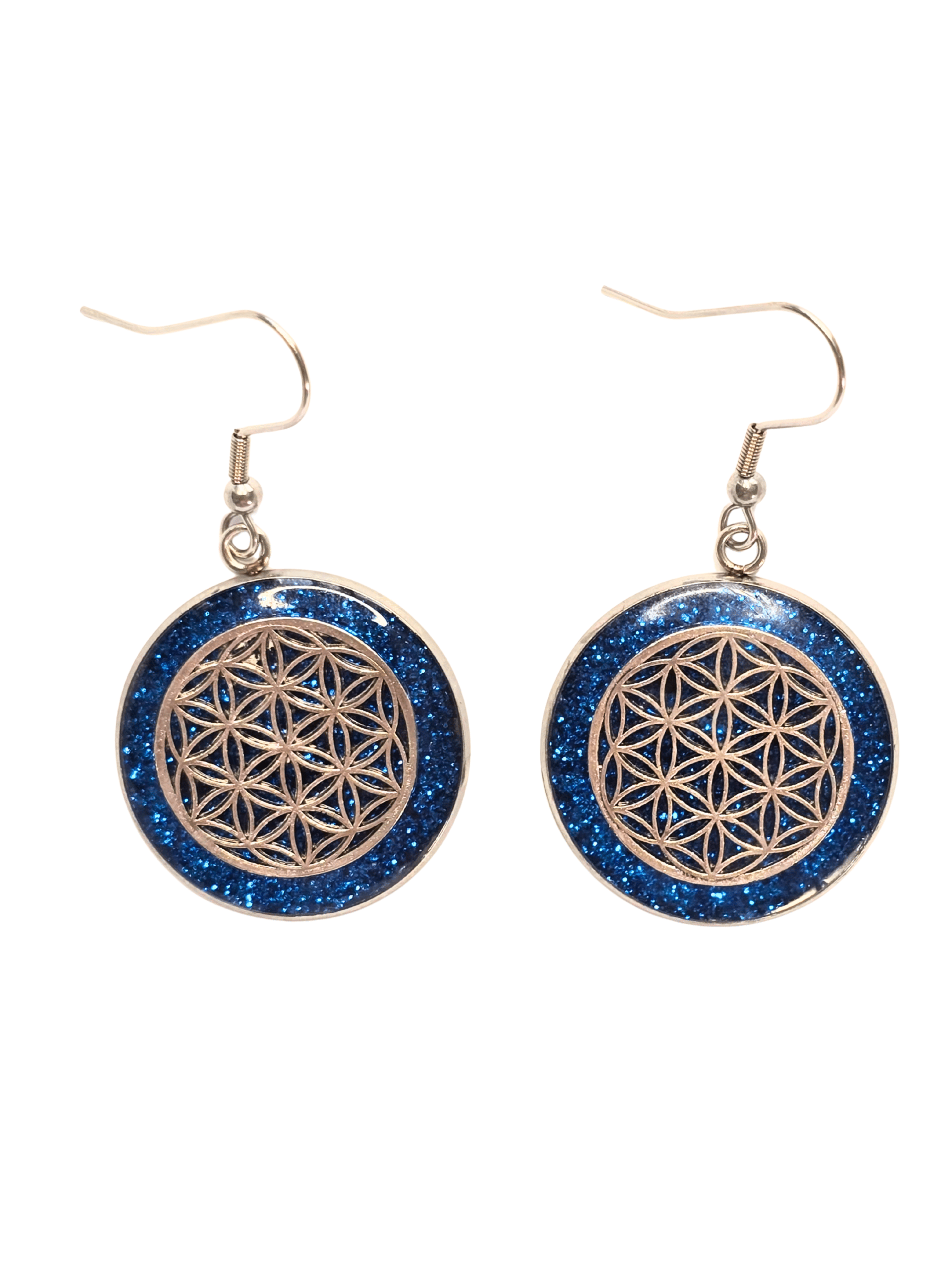 Les Boucles d’Oreilles Fleur de Vie Bleues « Ciel d’Énergie » sont conçues en acier inoxydable et disponibles en finition argentée ou dorée. Leur motif rond met en valeur un fond bleu profond en résine pailletée qui capte la lumière à chaque mouvement.